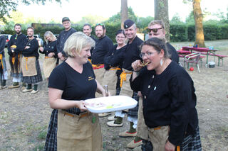 Michaela Krüger-Jungmann (l.) hatte alle Mühe mit den dargebotenen Speisen. Bruder Nico (2.v.l.) sprach ihr Mut zu.