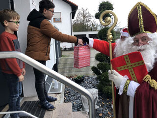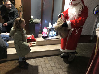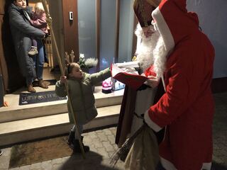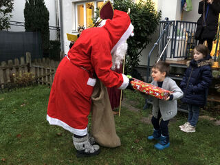Liv (7) steckt dem Nikolaus ein Geschenk zu.