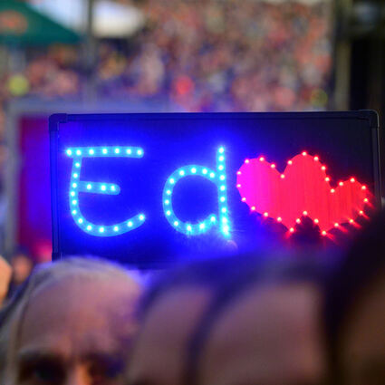 Mit einem Schlag ist für 100.000 Zuschauer auf dem Hockenheimring die strapaziöse Anfahrt vergessen: Ed Sheeran betritt die gigantische Bühne im mit Menschen voll gepackten Motodrom.