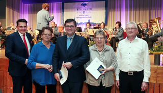 Die Vorstände des Evangelischen Kirchenchors 1875 Reilingen dürfen sich ebenfalls über eine Ehrung freuen. Hier von links: Bürgermeister Stefan Weisbrod, Sabine Petzold, Frank Powik, Hannelore Astor und Uwe Schuppel