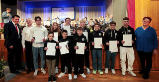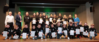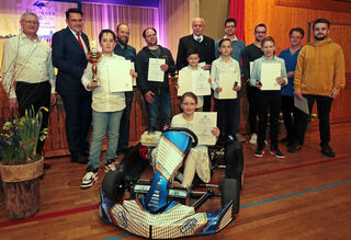 Hier wird der AMC geehrt: Mannschaft, Automobil, Einzel Automobil, Einzel Kart und Landesehrennadel, hinten v.l.: Uwe Schuppel, BM Stefan Weisbrod, Felix Terlinden, Julian Hieroth, Gerd Römpert, Markus Liebenstein, Christian Deubel, Sabine Petzold und Tim Schestag, davor v.l.: Jannis Zararis, Louis Wölfelschneider, Daniel Lang, Thiederik Terlinden und im Kart: Magdalena Terlinden
