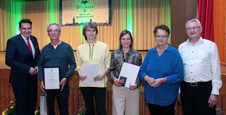 AMICI Reilingen-Mezzago: Die Vorstände dürfen sich ebenfalls über eine Ehrung freuen. Hier zu sehen: Uwe Schuppel, BM Stefan Weisbrod, Ingrid Müller, Annette Herzberger, Monika Kasper und Sabine Petzold.