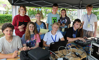 Die "Technik-AG" stehend v.l.: Simon, Helen, Florian, Julia und Mika; sitzend v.l.: Emil, Tanja, Michael und Linus.