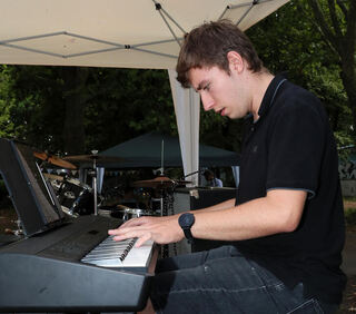 Paul begleitet die Veranstaltung an verschiedenen Instrumenten.