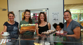 Kaffee und Kuchen gibt es auch. Maren Sillmann (v. l.), Julia Schuhmacher, Stefanie Grimm, Rosie und Anne Ogwu.