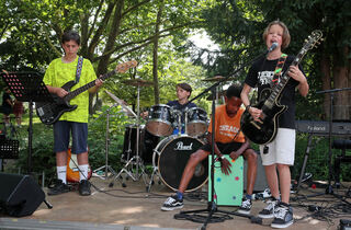 Eine Band aus Fünft- und Sechsklässlern - Marco (v. l., Bass), Noah (Schlagzeug), Sem (Cajon) und Vincent (Gitarre) ist ebenso zu hören...