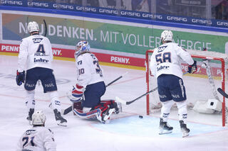 Um das gegnerische Tor versammelt: Markus Hännikäinen von den Adlern Mannheim und Frederik Tiffels (Eisbaeren Berlin).