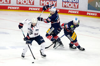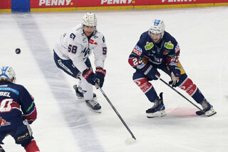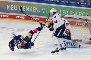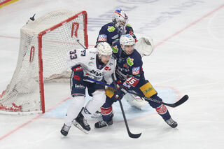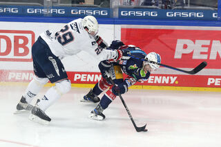 Ordentlicher Zweikampf zwischen Berlins Tobias Eder und Mannheims Markus Hännikäinen.