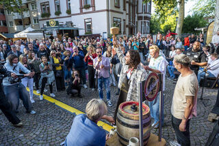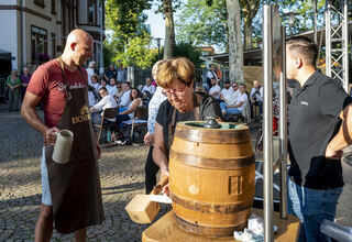 Bei der Eröffnung auf dem Fischmarkt ist viel los und der gebürtig aus Speyer stammende Sänger der Band Bojan „Boki“ Kalajdzic darf assistiert von OB Stefanie Seiler das Bierfass anstechen