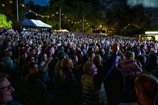 Im Paradiesgarten der Dreifaltigkeitskirchengemeinde herrscht reger Betrieb im Garten und am Ausschank und auf der Bühne unterhält gerade die Band die Funk Charge