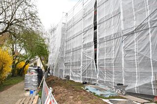 Die Nordseite der Kirche mit den denkmalgeschützten Emil-Wachter-Fenstern erhält eine Betonsanierung.