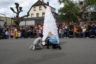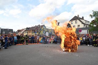 Bürgermeisterin Patricia Rebmann brennt mit Unterstützung eines Kindes aus dem Publikum den Winterbutzen schließlich an. Immerhin sollen nun Frühling und Sommer kommen.