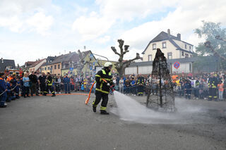Oberfeuerwehrmann David Windisch löscht die letzten glimmenden Rest des Winterbutzens. Der Sommer kann kommen...