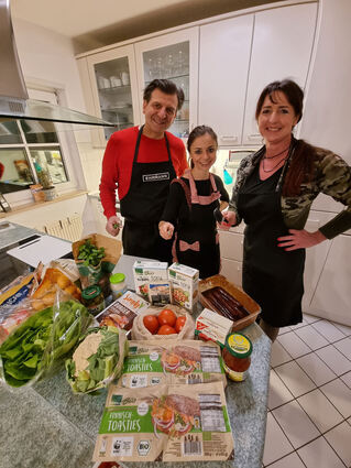 Es kann losgehen: Daniel und Heike Vennari kochen gemeinsam mit Vanessa Schäfer (M.) ein veganes "American Diner".