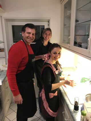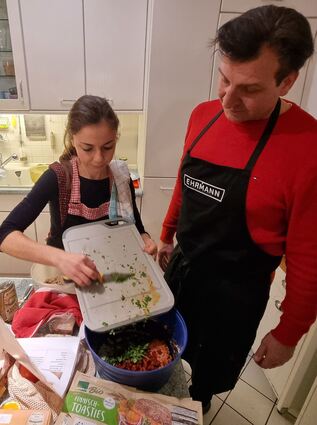 Unter der Anleitung von Vanessa Schäfer (vorn) helfen alle - hier Daniel Vennari und Redakteurin Katja Bauroth - bei der Zubereitung des veganen Essens.