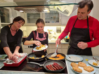 Am Herd geht's rund: Heike Vennari stellt fertige Speisen auf die Wärmeplatte, Vanessa Schäfer brät die Tofu Wings an und Daniel Vennari wendet die Burger. Die "Würstchen" (Möhren) in der Pfanne werden von der Fotografin betreut...