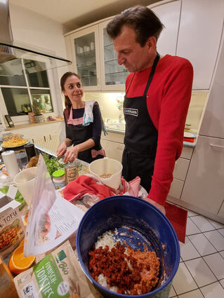 Beratung in der Küche: Beim Veganuary-Abschluss-Kochen gibt es noch einmal direkt Kochtipps von Vanessa Schäfer für Daniel Vennari.