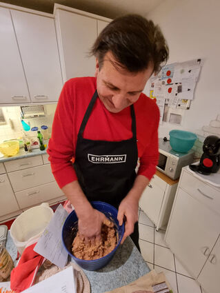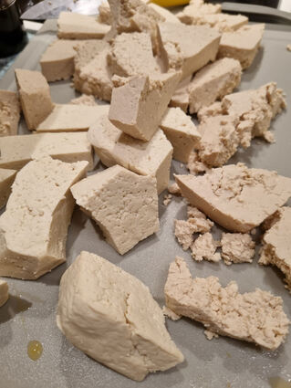Daniel Vennari zerkleinert den Tofu für die Burger Patties.