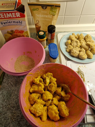 Blumenkohlröschen werden erst in einer Mischung aus Sojamehl und Wasser gewürzt mit Kurkuma, Pfeffer und Paprika gewendet und dann paniert. Man kann sie in der Pfanne oder im Backofen (fettarm) zubereiten.