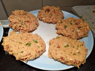 Vegane Burger Patties. Unter www.schuerzentraegerin.de gibt es vegane Rezepte - die Patties wurden nach der Vorlage der veganen Hackbällchen gemacht.