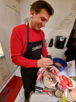Vanessa Schäfer gibt geschnittene frische Petersilie zur Masse für die Burger Patties hinzu. Daniel Vennari darf dann ran zum Verkneten der Zutaten.