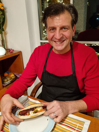 Daniel Vennari zeigt stolz den veganen Hotdog - ein optisches Highlight, welches auch geschmacklich glänzt.