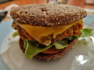 Mahlzeit! Der vegane Burger schmeckt und macht richtig satt. Statt Burgerbrötchen wurden Finnisch-Toasties genommen. Alternativen wären auch Roggenbrötchen oder Vinschgauer.