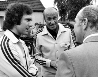 Bundestrainer Helmut Schön (Mitte) und Kapitän Franz Beckenbauer (l.) 1974 im WM-Trainingslager der deutschen Fußballnationalmannschaft in der Sportschule bei Kamen.