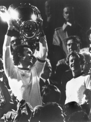 Franz Beckenbauer 1976 mit dem Europa-Pokal der Landesmeister.