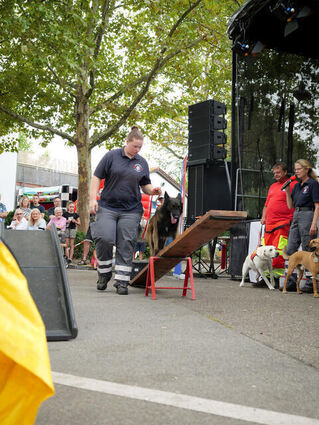 An der Wippe wird das Können der Hunde dem Publikum präsentiert.