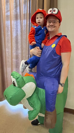 Jannis (2) mit Papa Dominik als Super Marios, Yoshi fehlt dabei auch nicht.