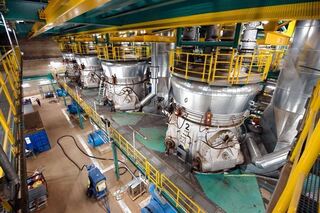 Vier mächtige Kohlemühlen - jede zehn Meter hoch - mahlen die Steinkohle staubfein. Anschließend wird sie in den Kessel eingeblasen, wo sie im Flug verbrennt. Eine Mühle kann bis zu 65 Tonnen pro Stunde mahlen, etwa das Fassungsvermögen eines Güterwaggons.