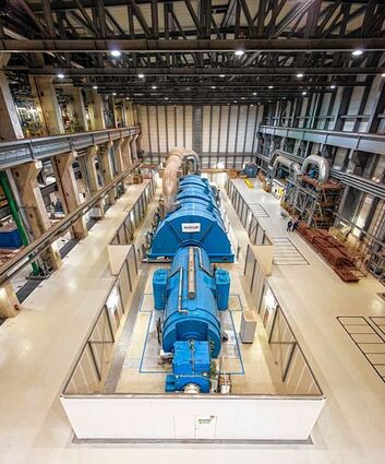 Mit 290 bar Druck und einer Temperatur von 600 Grad wird der Dampf anschließend auf Turbinen geleitet und treibt diese an. Die Bewegungsenergie wandelt der Generator in elektrische Energie um. Der 454 Tonnen schwere Generator läuft mit 3000 Umdrehungen pro Minute. Damit Turbinen und Generator einen festen Stand haben, sind im Maschinenhaus rund 2000 Kubikmeter Beton verbaut.