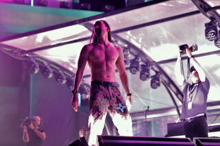 Steve Aoki lässt die Muskeln spielen.