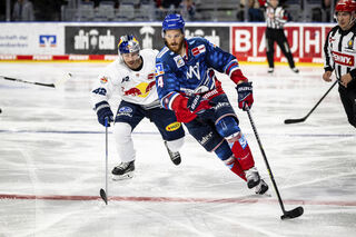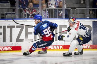 Yasin Ehliz (EHC Red Bull München) jagt Mannheims Korbinian Holzer hinterher.