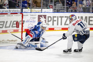 Arno Tiefensee verteidigt das Mannheimer Tor vor Frederik Tiffels vom Red Bull München.