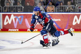 Korbinian Holzer (Adler Mannheim) wehrt Ben Smith vom Red Bull München ab.