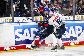Crash gegen die Bande: David Wolf (Adler Mannheim) und Chris DeSousa (EHC Red Bull München) im Zweikampf.