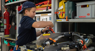Timo zeigt ein hydraulisches Rettungsgeträt.