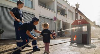 Hannah probiert bei den Wasserspielen mit Quentin (links) und Timo (2. v. l.) ein brennendes Holzhaus zu löschen.