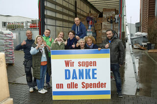 Gruppenbild mit Helfern:Der Transport für behinderte Kinder aus der Ukraine wird beladen.