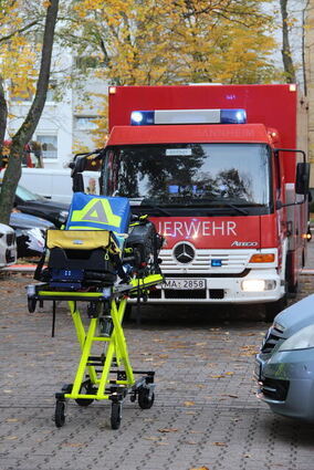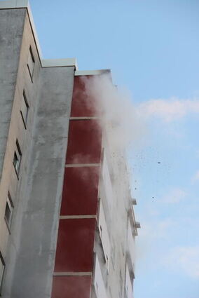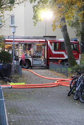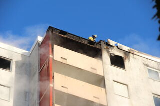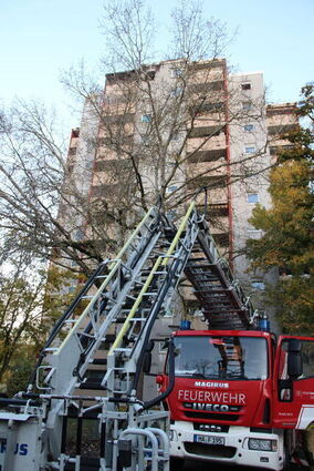 Die Feuerwehr positionierte eine Drehleiter vor dem Hochhaus.