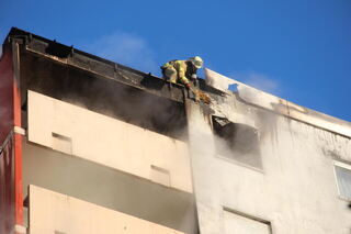 Ein Feuerwehrmann ist mit einer Axt auf dem Hochhausdach zugange.