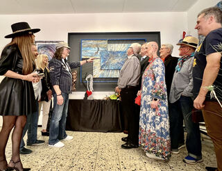 Künstler Gustav Armbrust (4. v. l.) erläutert bei der Eröffnung des Pop-up-Stores Gästen einige seiner Werke.