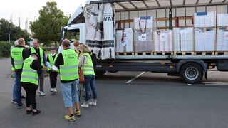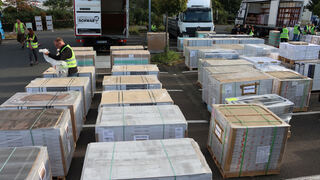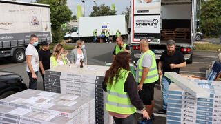 Frisch entladen: Die von verschiedenen Herstellern und Großhändlern gespendeten Paletten stehen bereit, ausgepackt zu werden.