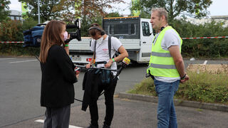 Ein Fernsehteam interviewt den Initiator der Aktion, Günter Bochenek (r.), der für das Holz-Zentrum Schwab tätig ist.