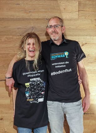 Sponsoren auf T-Shirt verewigt: Roman Böcking und Manuela Mack präsentieren das Textil zur Aktion.