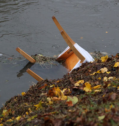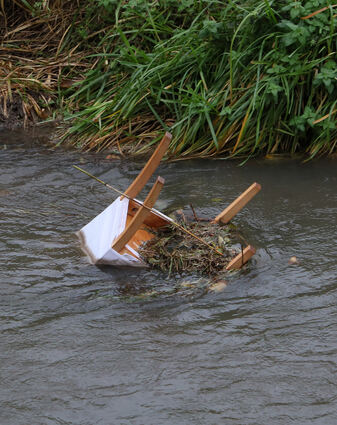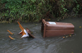 Ein Stuhl und eine Biotonne liegen im Kraichbach – die Gegenstände sind auf eine weite Strecke verteilt, untypisch für wilde Müllentsorgung.