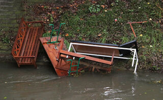 Gartenbänke, Tische, eine medizinische Liege liegen kreuz und quer am Kraichbachufer und teilweise im Wasser.