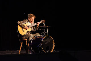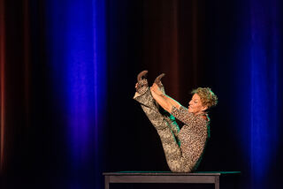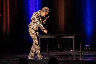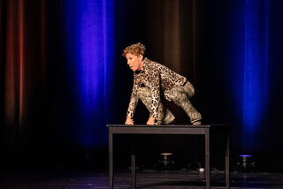 Perlinger animiert das Publikum, zur Lockerung der Gesichts- und Lachmuskeln Affenlaute nachzumachen.
